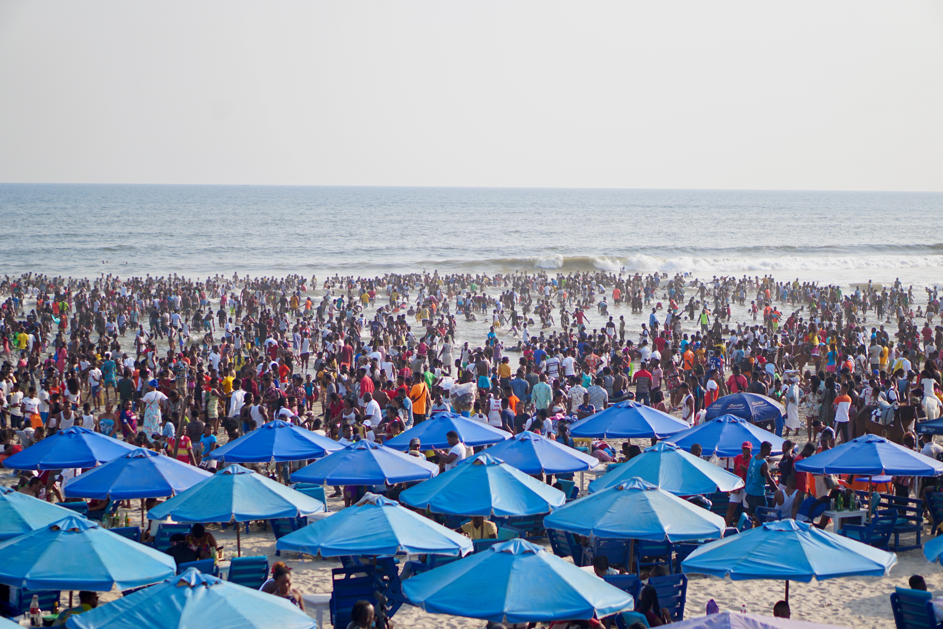Once we arrived, I paid an entrance fee of 20 Ghanaian Cedis (about USD 2) and made my way to the rooftop area of Mac Bay restaurant. Below, the sandy beach was dotted with tables, each packed with revelers under a cluster of colorful umbrellas.
